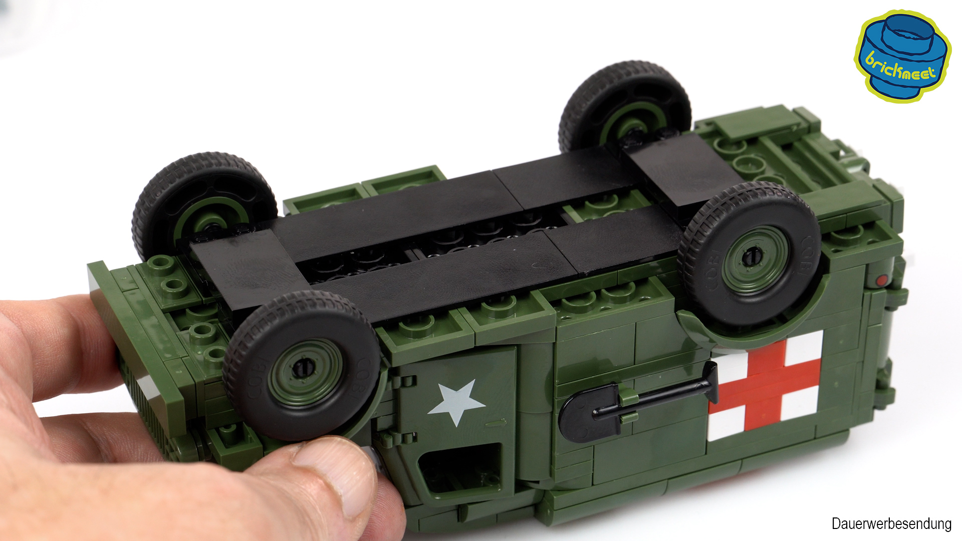 Den Anfang in diesem Set macht der Krankenwagen. Hier bilden wir zunächst eine Grundlage aus COBIs speziellen Fliesen, auf die dann die Karosserie aufgebaut wird. Das Reserverad muss anders montiert werden als die restlichen Räder. Ansonsten lässt sich der Kotflügel nicht montieren. Die roten Kreuze bestehen weder aus Aufklebern noch aus Aufdrucken. Stattdessen werden sie aus Bricks gebaut, was sich bei der einfachen Form natürlich geradezu anbietet. Das Dach wird separat gebaut und mit Fliesen abgedeckt. Diese bilden ein großes rotes Kreuz. Bei den Hecktüren kommen wieder COBIs Spezialfliesen zum Einsatz, die bedruckt sind.