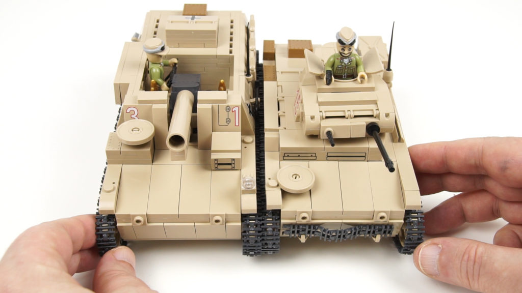 Da der Sturmpanzer II auf dem Panzer II basiert, ist die Ähnlichkeit kaum zu verleugnen. In der Breite sind beide identisch, auch wenn das reale Modell ein paar Zentimeter breiter wurde. Das lässt sich mit Noppen kaum darstellen. In der Länge sieht es da schon anders aus. Diese spiegelt sich auch im Modell wieder und man sieht aus auch ohne direkten Vergleich an der zusätzlichen Laufrolle. Im Vergleich zum Tiger 131 ist der Sturmpanzer II natürlich eher klein.