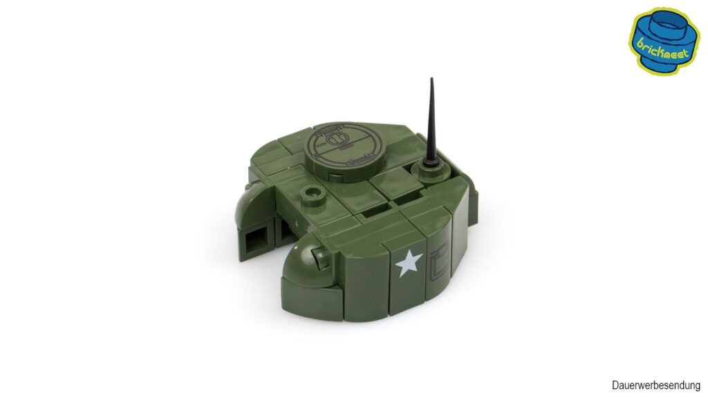 Für den Turm wird eine kleine Basis mit Baurichtungsumkehr gebaut. Daran werden separat gebaute Seitenpanzerungen befestigt. Eine gedruckte Luke und eine Antenne sind die einzigen Dekoelemente. Das Rohr besteht aus einer einzigen Bar und wird über C-Clamps befestigt.