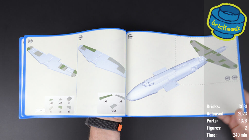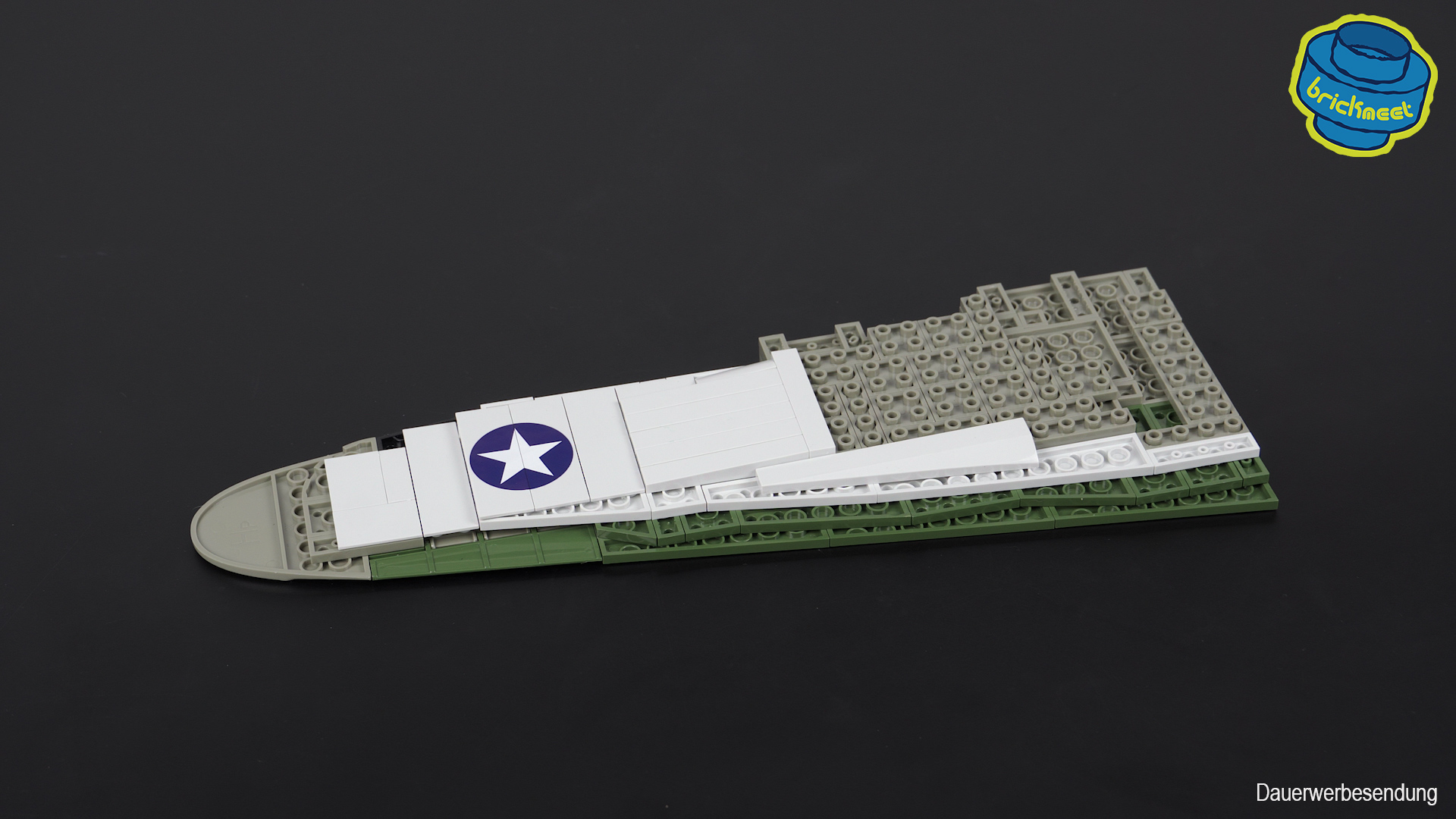 Wie so oft beginnen wir auch hier mit den Flügeln, die einzeln gebaut werden. Der Rumpf wird nahezu noppenfrei gebaut. Die einzig sichtbaren Noppen findet man im hinteren Bereich bei den Maschinengewehren. Die Flügel können nun von oben oder unten angebracht werden. Ich habe mich, entgegen der Anleitung, von unten entschieden. Die Scharniere von unten haben beide Flügel verbunden. Jetzt werden sie von oben mit weiteren Scharnieren gekontert. Grundsätzlich ist das recht stabil, aber man sollte das Flugzeug nicht an den Flügeln tragen. Dabei lösen sie sich von unten und klappen nach oben weg.