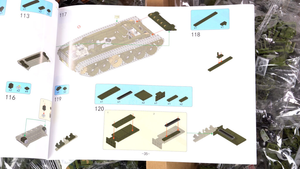 Wer schon Modelle von Panlos gebaut hat, wird schnell Gemeinsamkeiten feststellen. Wir beginnen mit Plates, auf die viele kleine Plates und Fliesen aufgebracht werden. Diese werden direkt von einreihigen Bricks eingerahmt. So arbeiten wir uns Stück für Stück vor, bis der untere Teil der Wanne fertig ist. Da hier reichlich Interieur verbaut wird, kommen zahlreiche bedruckte Steine zum Einsatz. Das Cockpit mit seinen Instrumenten sieht wirklich klasse aus. Die Laufrollen und Ketten werden bereits in einem sehr frühen Stadium angebracht. Der anschließende Test zeigt, dass die Ketten nicht perfekt sind, aber dennoch erstaunlich gut laufen.