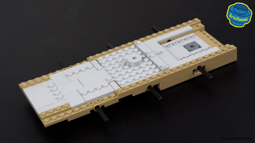 Der Aufbau der Wanne ähnelt durchaus einem kleinen Gebäude. Das liegt daran, dass der komplette Innenraum für die Inneneinrichtung genutzt wird. Dazu gehört ein komplexer Motor, der Munitionsvorrat und das Cockpit. Die Laufrollen werden im Dreierpack schwingend angebracht und bilden somit eine Art Federung. Die restliche Wanne besteht aus dünnen Wänden, die nur an wenigen Noppen befestigt werden. Wie schon bei der Maus sorgt das für eine gewisse Instabilität.