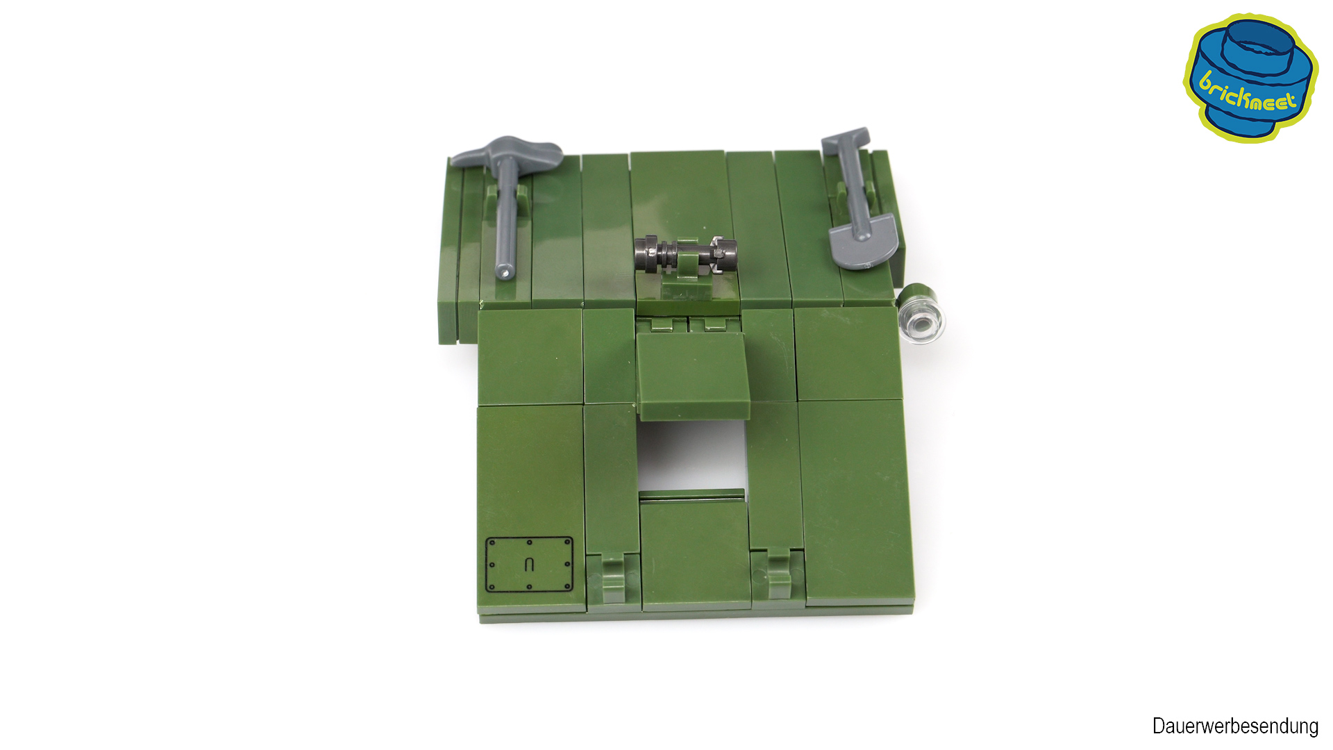 Die Bautechniken unterscheiden sich nicht wesentlich von anderen Herstellern und auch hier setzt man auf Baurichtungsumkehr. Nur so lassen sich abgeschrägte Panzerungen für die Kanzel bauen. Da wir einen Innenraum haben, wird die Wanne nicht einfach gefliest. Stattdessen bauen wir Abdeckungen, die sich auch später noch öffnen lassen, um in das Innere zu gelangen. An dieser Stelle kommen auch zahlreiche bedruckte Fliesen und Dekoelemente zum Einsatz. Aus den beigelegten Werkzeugen, Waffen und Accessoires nehmen wir uns eine Axt und eine Schaufel und setzen sie an die Frontpanzerung.